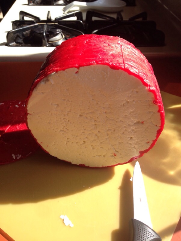 We pulled, unwaxed, and quartered it, taking one to eat now, and vacuum packing the other three and returning them to the cave. We’ll let them go 2, 3, and 6 months to see how that impacts taste. It joined a lovely wheel of Cheddar that just started it’s cave time; we’ll give that one 90 days before we give it a try.