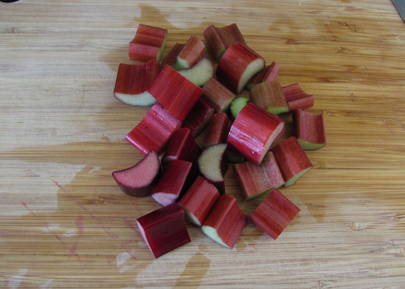 For pie or preserving, the prep process is the same. Choose firm, healthy red-green stalks, wash them thoroughly, and if they’re a variety that has a tough outer skin, peel that off. Chop about 2″ off the top and bottom of each stock, then cut the stocks into roughly 1″ chunks.