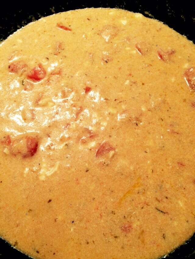 Add tomatoes, undrained, and stir to heat through. When the sauce is bubbling, reduce heat to low, add cream and cheese and stir constantly until well incorporated. Serve promptly over pasta, chicken, pork, tofu or lightly sauteéd vegetables.