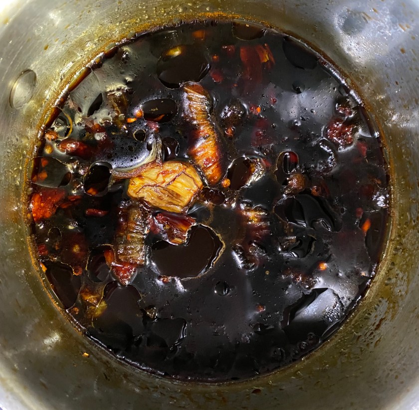 When the oil has cooled, you can strain off the chiles and garlic, or leave them in as you please, (personally, I’m eatin’ that garlic post haste)