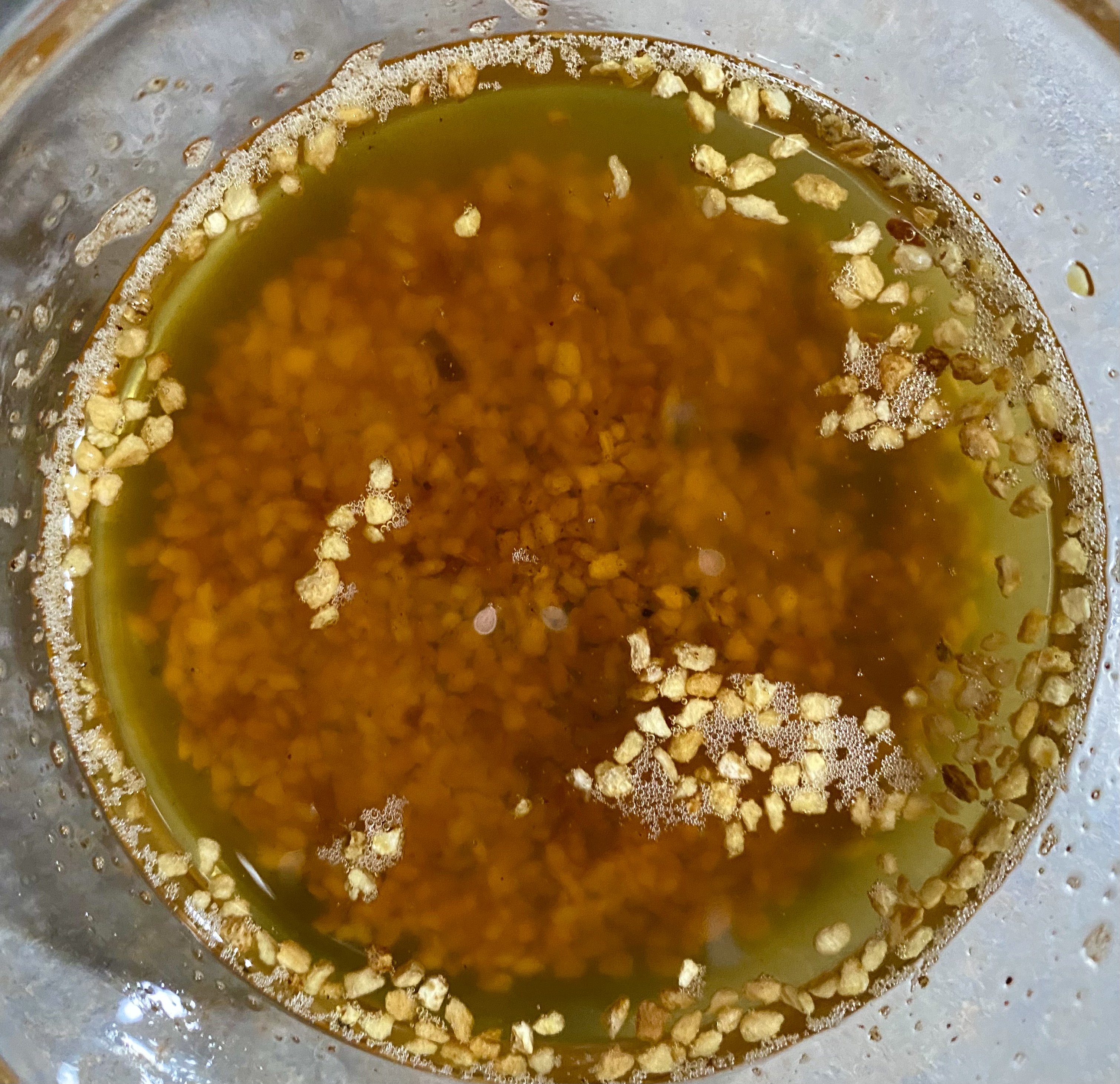 Finally there’s Oil, and it’s the one secret ingredient most likely to be missed – and it absolutely, positively must not be – it’s a critical element for some very good reasons. Oil is yet another place to add a little something, usually aromatics, that’ll make your ramen special. Secondly, oil is hydrophobic – it doesn’t mix with water much at all, (and broth is basically water.) When you add a little bit of oil to the bowl, (and you’ll add that at the start of composition, with the tare), it’ll float to the top once everybody is in the pool. The oil helps extract flavor from the broth, and adds its own subtle notes – it also seals the dish somewhat, helping your ramen to stay hot.