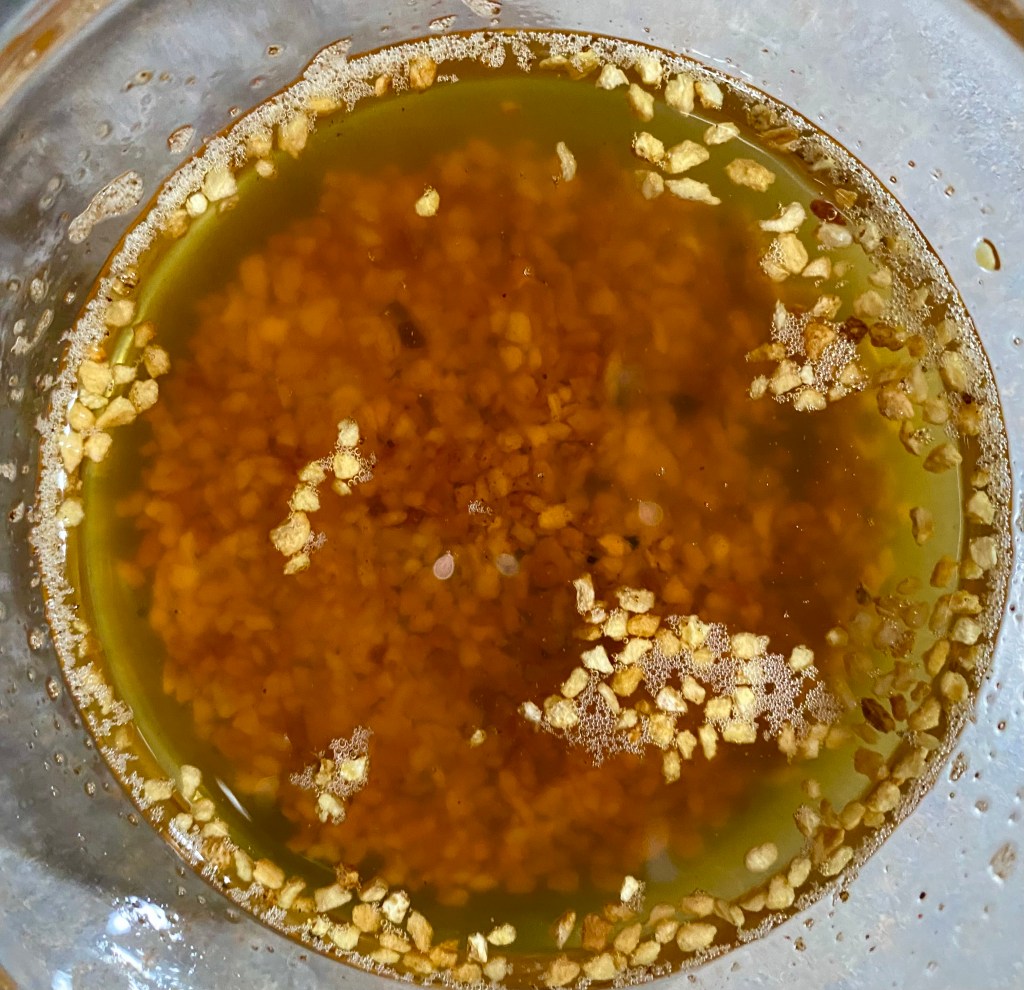 Remove oil and garlic from heat and slowly pour over the oil. I add about a tablespoon of minced, roasted garlic at this point – it adds a nice color and toasty flavor to the mix.
