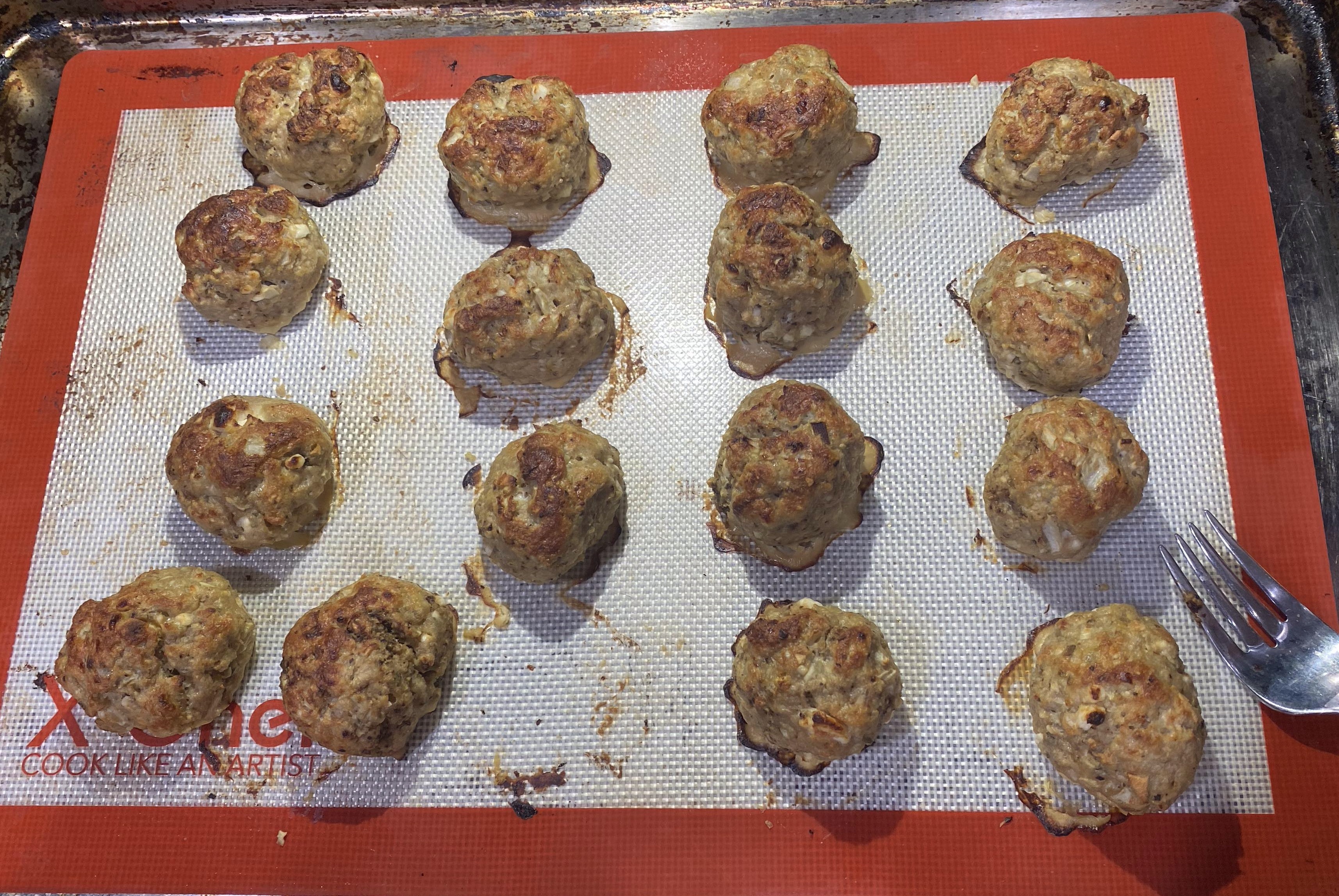 Size matters – when you’re ready to form, use a disher or an ice cream scoop if you’ve got one. If not and you’re rolling your own, thoroughly clean and dry your paws, then oil them lightly – that’ll keep the mix from stickin’ to ya. In essence, size should based on what you plan to do with ‘em – if you’re not sure/gonna do different things, a 2 oz. ball should work great. If it’s something like Italian wedding soup, 1 oz. is better. If it’s something where you really want them to stand out, and will serve maybe 2 or 3 per person, a 3 oz. ball is fine.