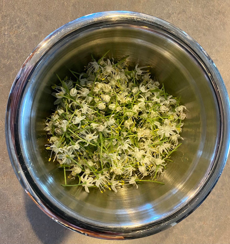 I garnished with sweet onion flowers and chives fresh from the garden – Use what you have and love, it’ll be perfect! Eric recommends thinly sliced scallion or finely chopped cilantro on his dish.
