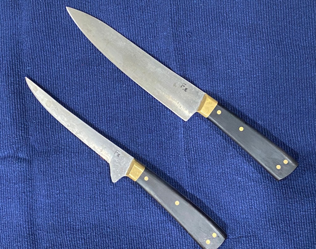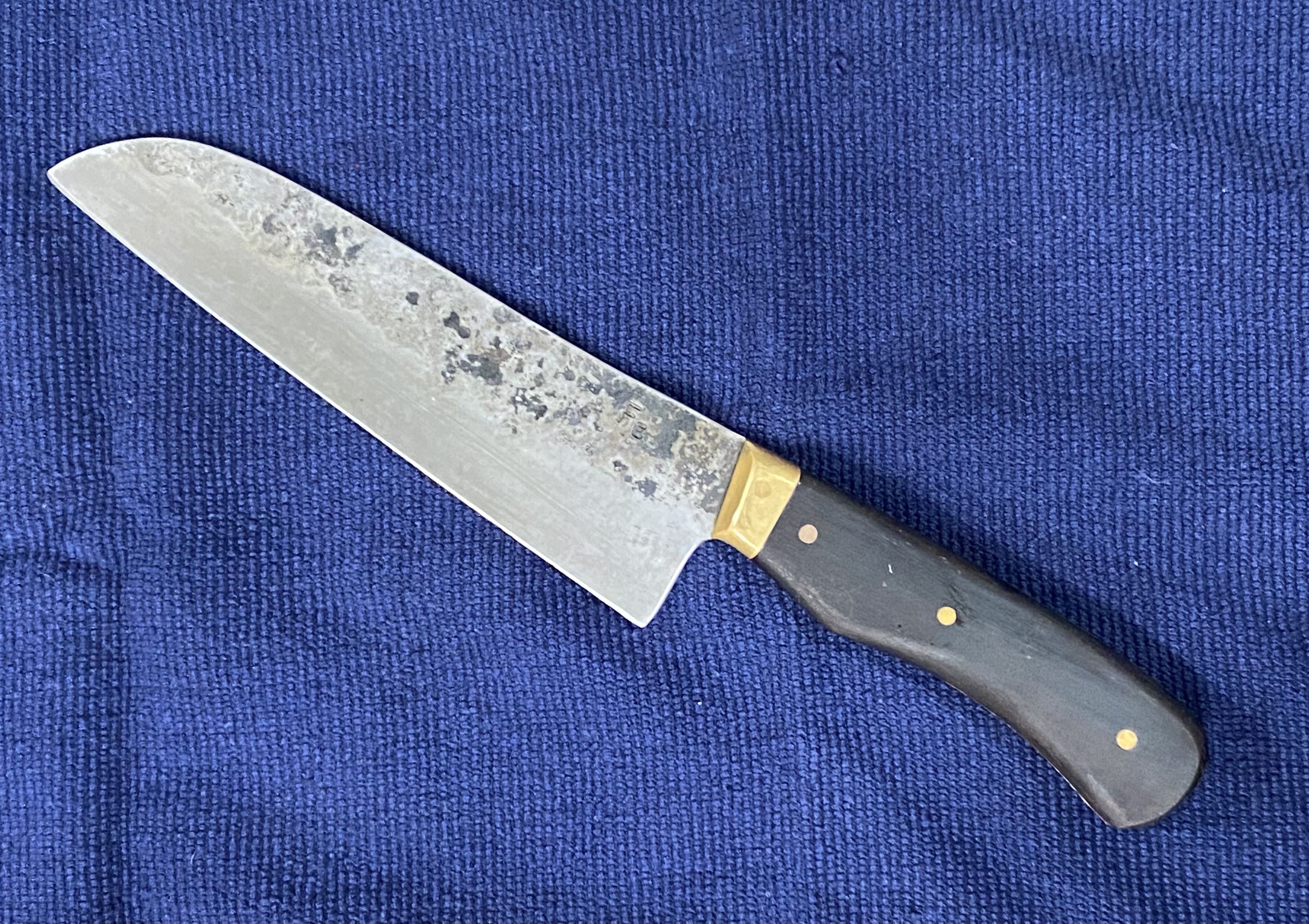 Every variant from cheap over the counter, to decent, to very high end production knives, semi-custom to true custom, is out there. While Henckles and Wusthoff, and Shun to Khun make great knives, there are small batch makers in both schools, here in the states and overseas, that you can check out. And then there are the true hand-makers, like Andy Gladish of Element Fe Forge here on Washington State’s Guemes Island – The man who makes my knives. His knives combine artistry with the age old science of hand forging; they are a delight in the hand and a joy to use. As with many makers, Andy sells production knives, as well as semi and true custom work. His stuff is, frankly, probably cheaper than it should be, which is your gain. If you find yourself at a farmers market up here in the northwest corner of the state, poke around and you’re likely to find Andy. You can have production pieces from him for under $50 a piece, and you could easily do a very, very nice three knife set for under $300. For hand made knives, that’s amazing. Wherever you live, you’ve likely got an Andy close by – If you’re to the point where the thought of a handmade blade or two appeals, go find them. In my case, the chance to collaborate with the maker, choosing blade composition, length, weight, flexibility, adding some pretty rare ebony handles made from wood I’ve had in my stash for a long time, coupled with brass bolsters and rivets, was the heart of why I wanted to go custom – It allowed my personal experience and preferences to be translated to the tools themselves – My recipe, in essence.