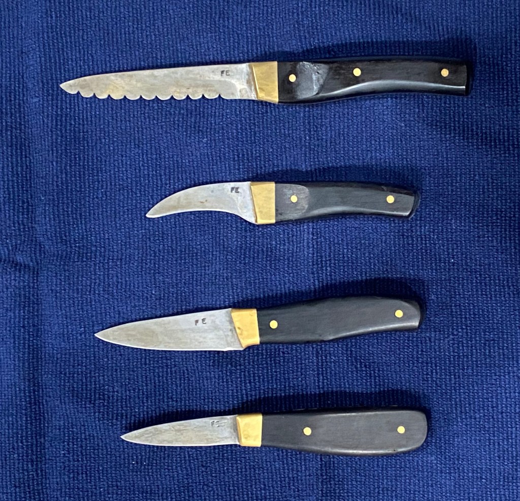 There were others after that one, of course – in fact, there were eight more, and as you can see, they’re the only knives I own and use every day. There’s the Thumbslayer, which is our riff on a Chinese cleaver, a boner, a carver, a serrated slicer, and four, count ‘em, four parers – a thin, flexible drop point 3”, a stiffer 3.5” spear point, a 3” hawkbill, and a 5.5” serrated – and yes, even Andy once asked, ‘haven’t I made you enough parers?!’